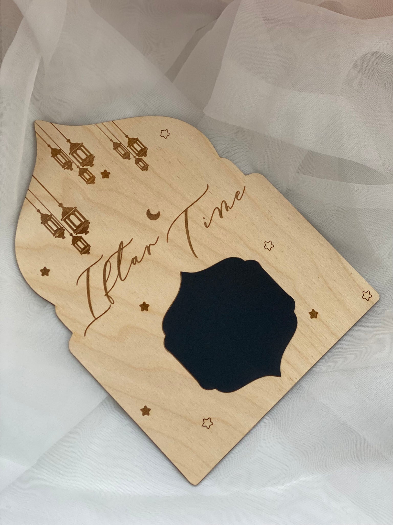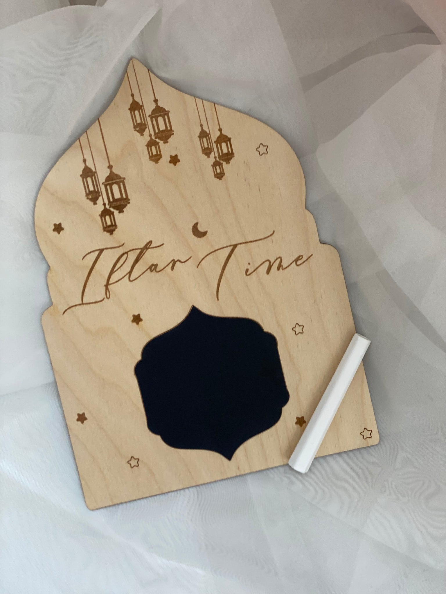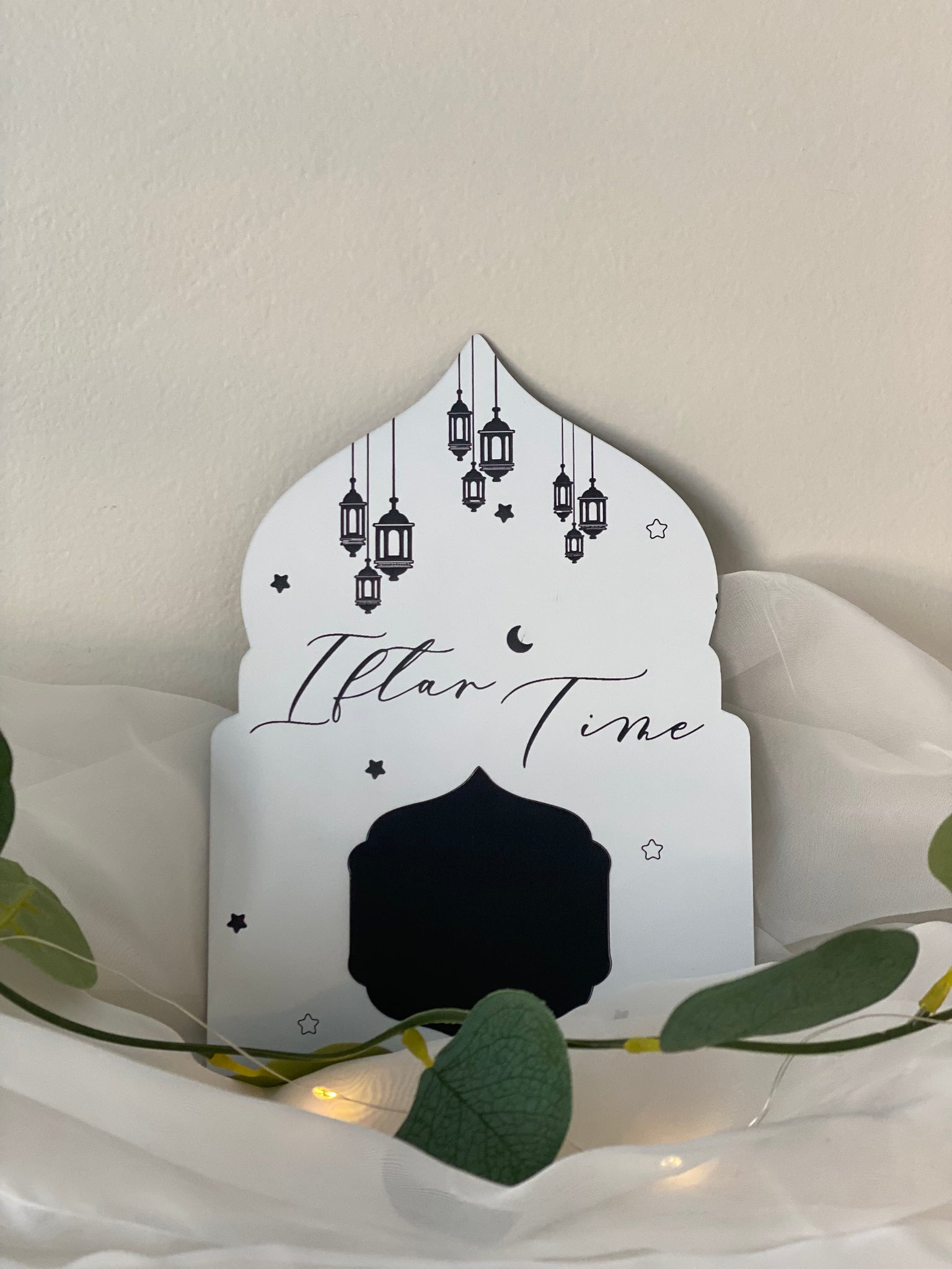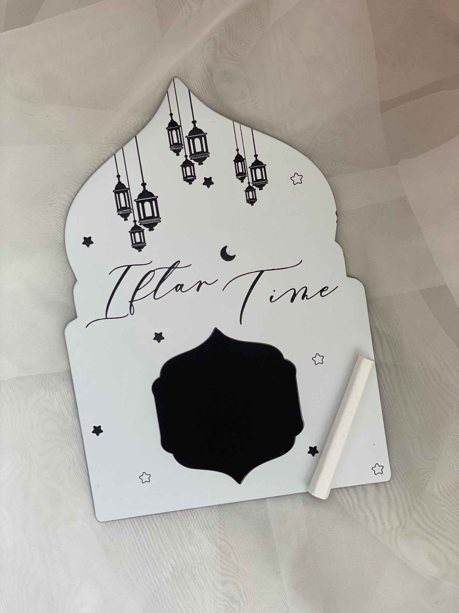 Each iftar time magnet includes: 1 iftar time plaque with a magnet backing and 1 piece of chalk.